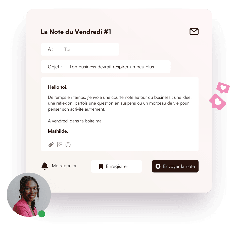 Les Notes du Vendredi sont un peu mon carnet de réflexion : j’y partage mes déclics, mes questions et les idées qui m’aident à penser le business autrement.